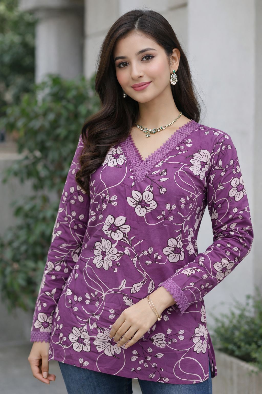 Add a touch of charm to your everyday ethnic wear collection with this beautifully designed purple floral printed short kurti. Crafted with soft, breathable fabric and enhanced with delicate lace detailing on the neckline and sleeves, this kurti blends traditional elegance with modern comfort.
