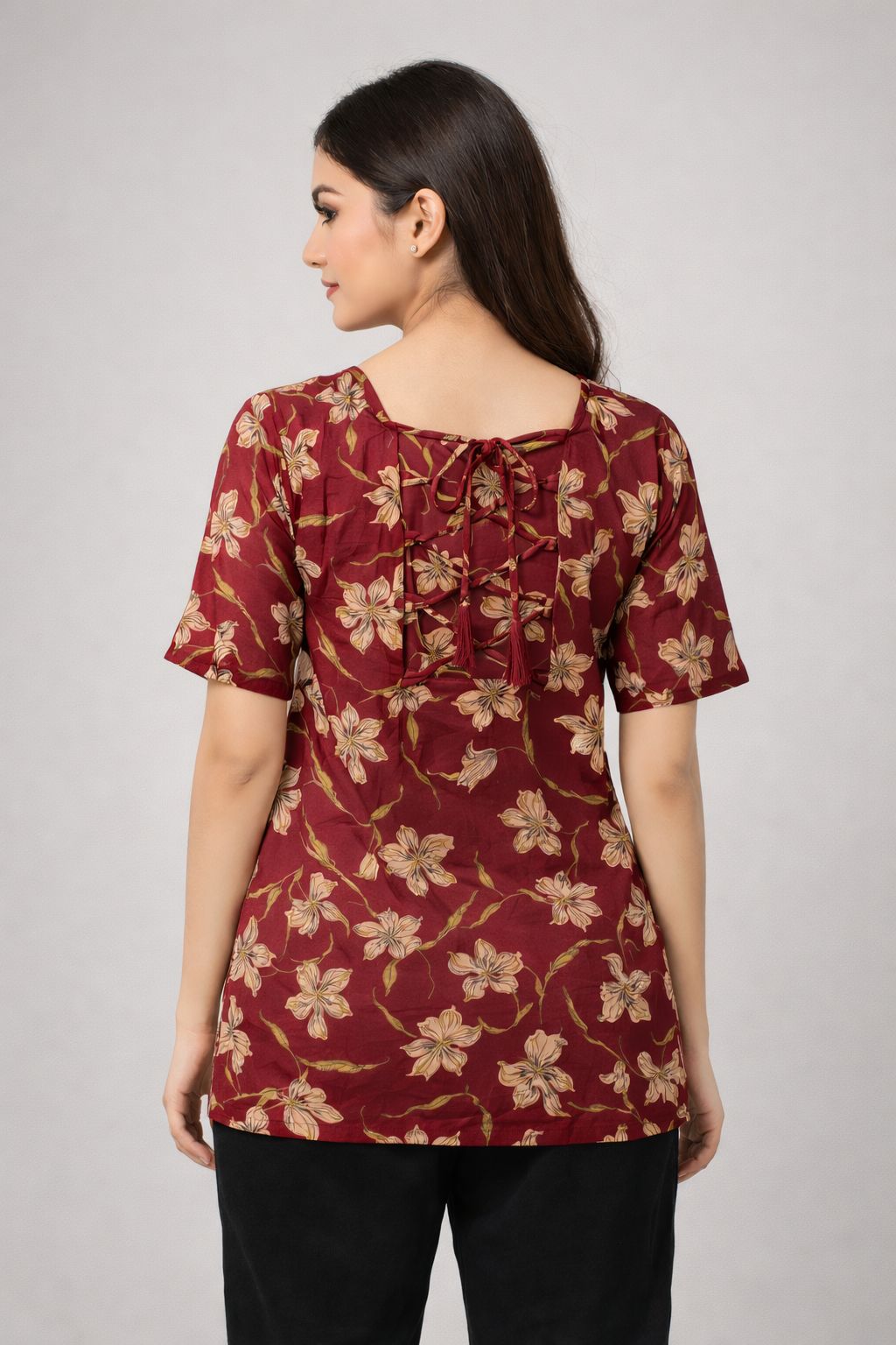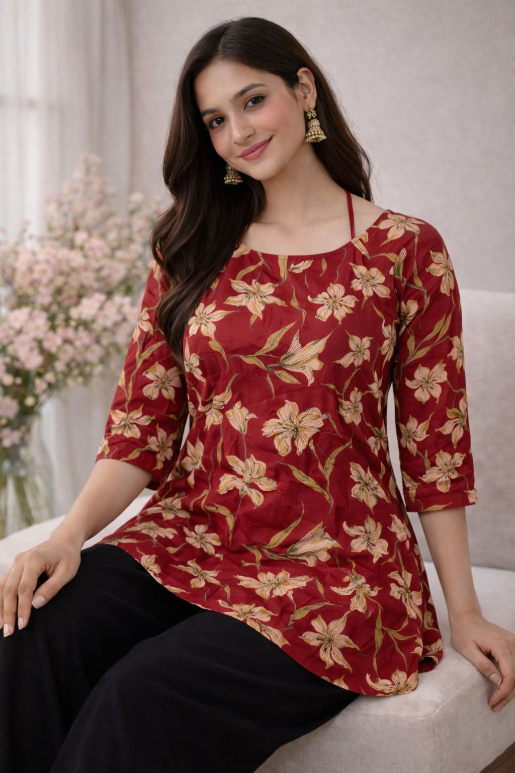 Add timeless charm to your everyday ethnic collection with this beautifully designed floral printed short kurti. Crafted in rich maroon tones with delicate floral motifs, this kurti features a classic round neckline at the front and a stylish lace-up crisscross back design that adds a modern twist. The soft, breathable fabric ensures all-day comfort while the flattering straight silhouette makes it perfect for both casual and semi-festive occasions.