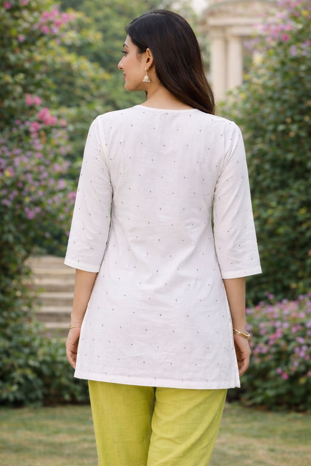 Bring timeless grace to your wardrobe with this stunningĀ Rosera Ivory White Short Kurti, thoughtfully designed for modern women who love subtle elegance. Crafted in a soft breathable fabric, this kurti features delicate minimal all-over dotted prints paired with a beautiful handcrafted-style mirror work front placket, adding a hint of sparkle without being overpowering.